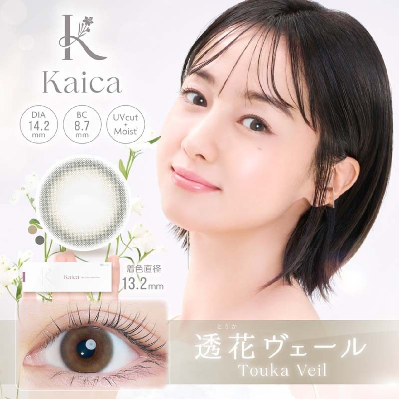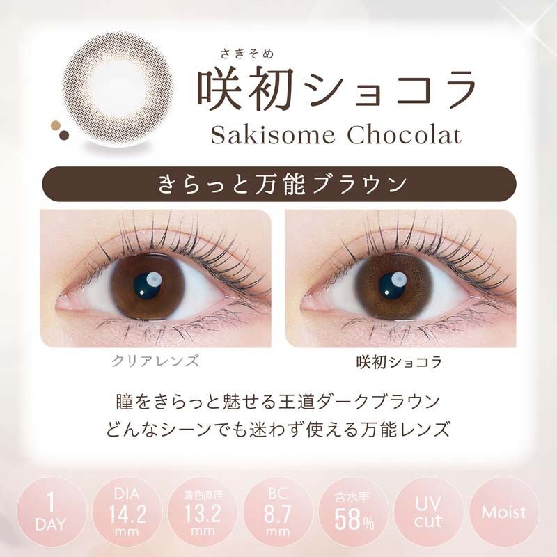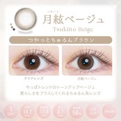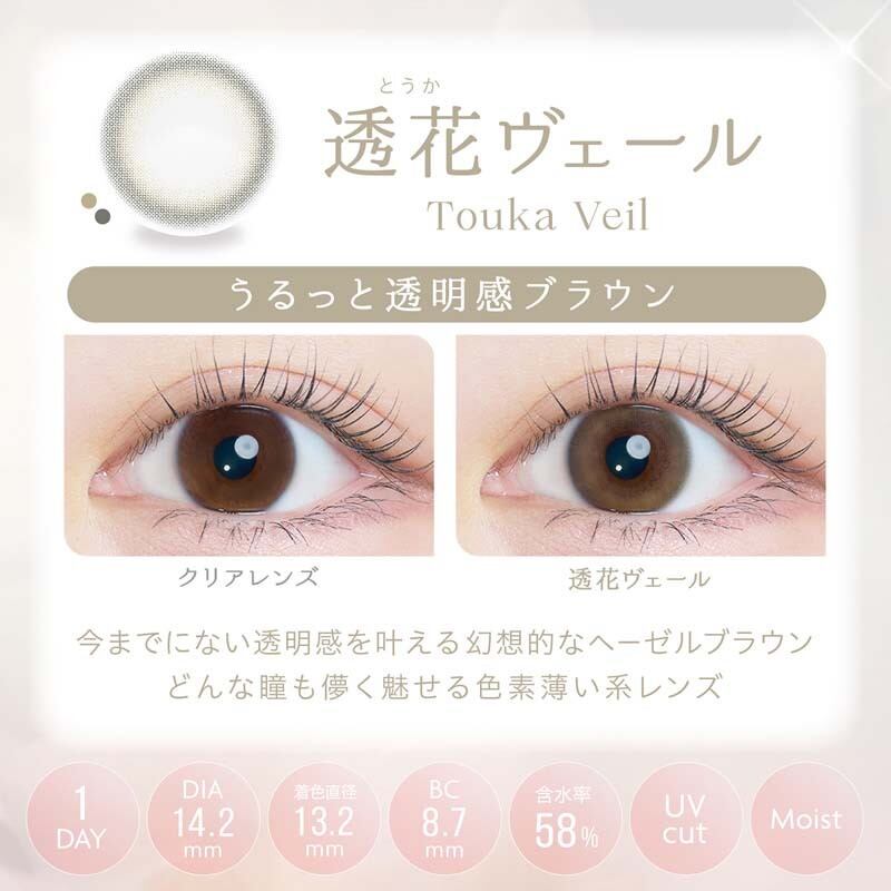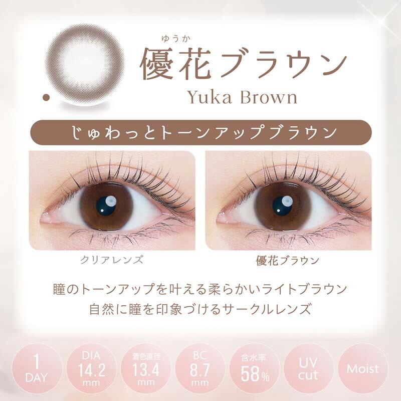 沢尻エリカイメージモデルのワンデーカラコン。花恋ベージュ、雪花グレー、透花ヴェール、淡花ヌード、咲初ショコラ、月絃ベージュ、優花ブラウン、優月ブラックの全8色。