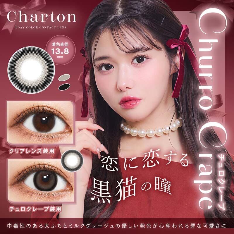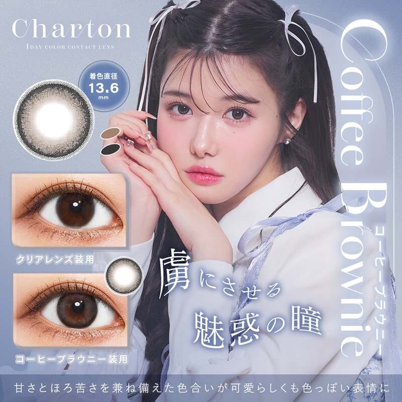 きぬイメージモデルのワンデーカラコン。フィグコンポート、チュロクレープ、コーヒーブラウニー、ビスケットスモア、アイスミュールの全5色。