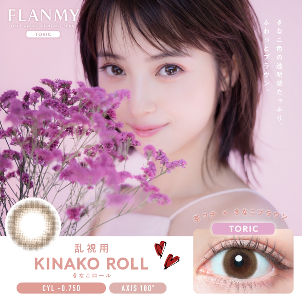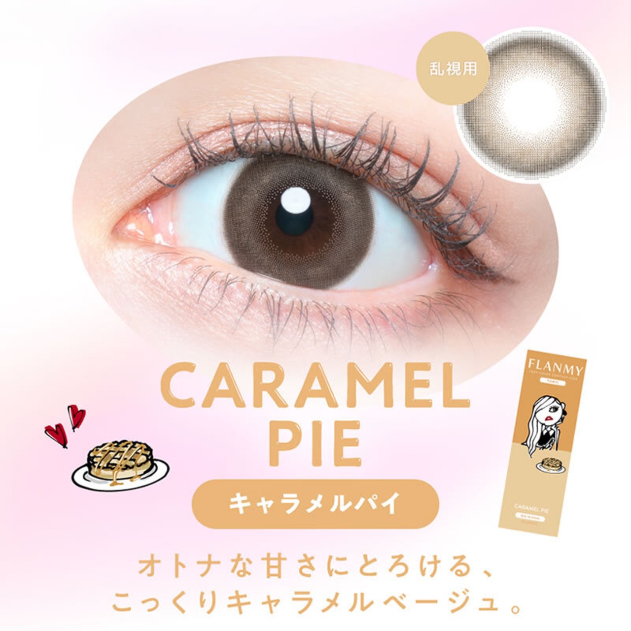 佐々木希イメージモデルの乱視用カラコン。ソルティーバニラ、キャラメルパイ、メープルシフォン、きなこロールの全4色。