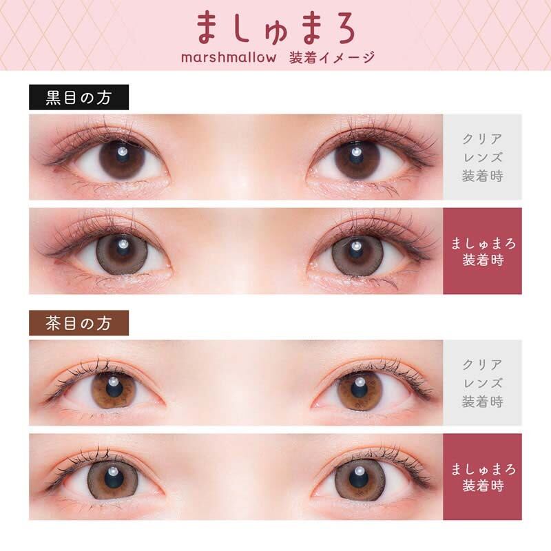 明日花キラライメージモデルのマンスリーカラコン。ワッフルチェックブラウン、ワッフルチェックグレー、黒蜜プリン、ましゅまろ、トゥンカロン、お月見だんご、スイカソーダ、もっとキマグレネコ/リングダークブラウン、もっと愛されうさぎ/リングピンクブラウン、もっとぽんぽこたぬき/パールライトブラウン、もっと褒められパンダ/ライトカーキブラウンの全11色。
