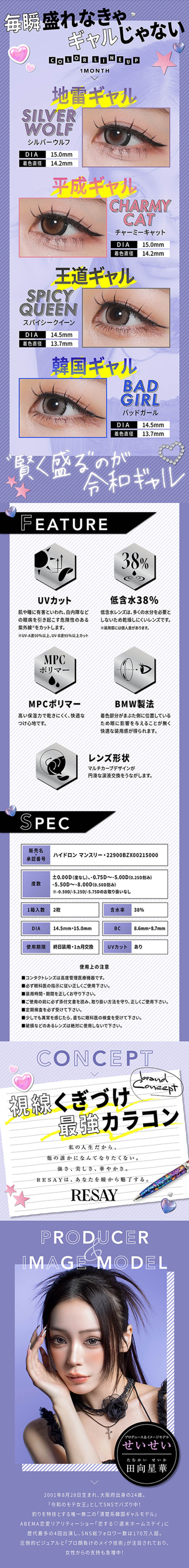 せいせい(田向星華)イメージモデルのマンスリーカラコン。シルバーウルフ、チャーミーキャット、スパイシークイーン、バッドガールの全4色。